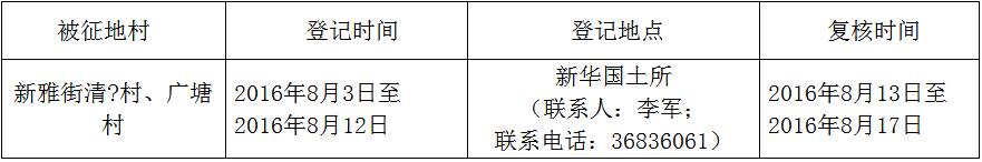 经省人民政府批准(粤国土资(建)字〔2015〕1013号文),需将bet365亚洲官网 新雅街清?村、广塘村属下的集体土地1.5124公顷(合22.686亩)征收为国有土地。现将经依法批准的《征收土地方案》和市人民政府批准的《征地补偿安置方案》内容以及有关事项公告如下: