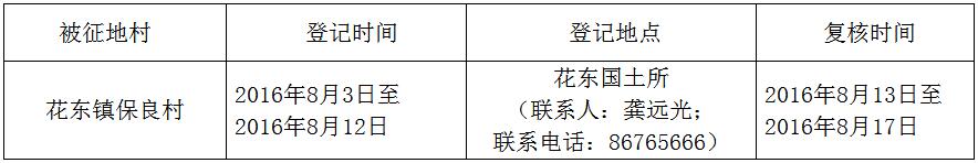 经省人民政府批准(粤国土资(建)字〔2016〕281号文),需将bet365亚洲官网 花东镇保良村属下的集体土地2.2196公顷(合33.29亩)征收为国有土地。现将经依法批准的《征收土地方案》和市人民政府批准的《征地补偿安置方案》内容以及有关事项公告如下: