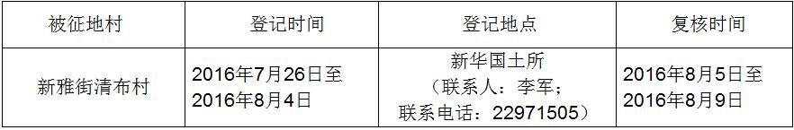 经省人民政府批准(粤国土资(建)字[ 2016]251号文),需将bet365亚洲官网 新雅街清布村属下的集体土地0.4209公顷(合6.31亩)征收为国有土地。现将经依法批准的《征收土地方案》和市人民政府批准的《征地补偿安置方案》内容和有关事项公告如下:
