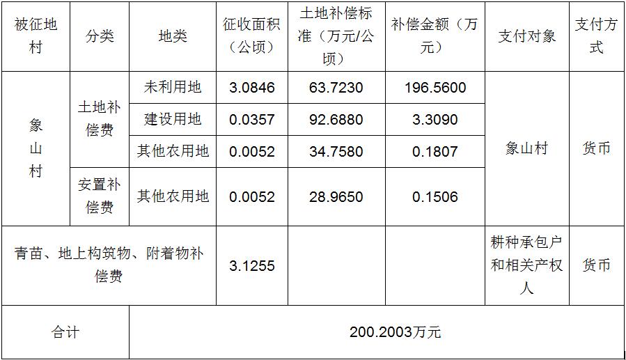 经省人民政府批准(粤国土资(建)字[2014]42号文),需将花都区花东镇象山村属下的集体土地3.1255公顷(合46.8825亩)征收为国有土地。现将经依法批准的《征收土地方案》和市人民政府批准的《征地补偿安置方案》内容和有关事项公告如下: